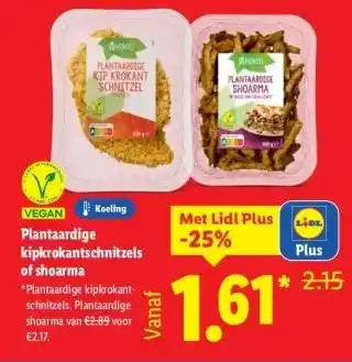 De prijs van de VEGAN Koeling Plantaardige kipkrokantschnitzels of shoarma kan ook teruggevonden worden hierboven op de pagina, samen met de datum van wanneer de aanbieding beschikbaar is. Ook kun je de prijzen in de huidige Lidl folder of op de Lidl website controleren. De aanbiedingen verzekeren je van het kopen van de Lidl producten voor de laagste prijs.