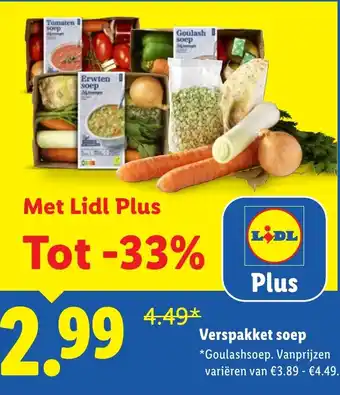 Geniet van heerlijke huisgemaakte soep met het Verspakket soep van Lidl. Kies uit Tomatensoep, Erwtensoep of Goulashsoep en maak eenvoudig een smaakvolle maaltijd. Met Lidl Plus ontvang je tot wel 33% korting op de normale prijs van €3.89 - €4.49. Met het handige pakket heb je alle verse ingrediënten in één keer in huis, zodat je snel en gemakkelijk kunt koken. De Goulashsoep is verkrijgbaar voor slechts €4.49. Profiteer van deze aanbieding en geniet van een warme kom soep op een koude dag. Haal jouw Verspakket soep bij Lidl en ontdek het gemak van vers en voedzaam koken.