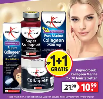 LUCOVITAAL Collageen Marine Bruistabletten bevatten Vitamine C, Hyaluronzuur en Collageen type 1 & 3 voor een stevige huid en behoud van sterke botten. Vitamine C ondersteunt de vorming van Collageen, wat de huid verstevigt en gezond houdt. Deze Aardbei-Rabarber smaak tabletten verminderen zichtbare tekenen van ouder worden. Met 5000 mg Super Collageen per dosering en 33 doseringen per verpakking. Nu tijdelijk 1+1 gratis actie, met 2 x 20 bruistabletten voor slechts €10,99. Gebruik de actiebon voor maximaal 2 acties per klant. Niet geldig in combinatie met andere acties en geneesmiddelen. Bestel nu en geniet van een stralende huid en sterke botten met LUCOVITAAL Collageen Marine Bruistabletten.
