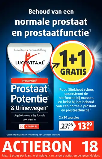 De Prostaat Potentie & Urinewegen is momenteel met korting verkrijgbaar bij Lucovitaal. Hier vind je alle details over prijs, geldigheidsduur en actievoorwaarden. Vergeet niet om ook andere aanbiedingen en deals voor Prostaat Potentie & Urinewegen te bekijken zodat je zeker weet dat je de beste prijs betaalt. De kortingsactie loopt van 18-01-2026 tot 24-01-2026. Is de actie inmiddels verlopen? Geen zorgen, vergelijk dan soortgelijke aanbiedingen of volg de productcategorie voor toekomstige prijsverlagingen. Zo koop je altijd met voordeel.Veelgestelde vragen over Prostaat Potentie & Urinewegen