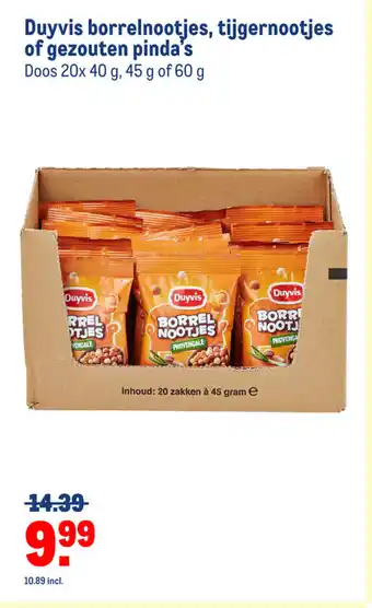 De prijs van de Duyvis borrelnootjes, tijgernoorjes of gezouten pinda's kan ook teruggevonden worden hierboven op de pagina, samen met de datum van wanneer de aanbieding beschikbaar is. Ook kun je de prijzen in de huidige Makro folder of op de Makro website controleren. De aanbiedingen verzekeren je van het kopen van de Makro producten voor de laagste prijs.