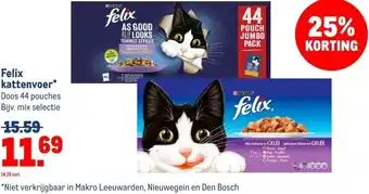 Makro biedt naast de Felix kattenvoer een ruime collectie producten aan. Houd de wekelijkse Makro folder in de gaten om de beste aanbiedingen en acties te vinden. Naast Felix kattenvoer, kunt u ook de volgende aanbiedingen vinden: Felix Kattenvoer Droog Countryside Sensations 1 kg, Felix kattenvoer in gelei original vis adult 85 g 12 stuks & Felix kattenvoer in saus heerlijke reepjes vis adult 80 g 12 stuks.
