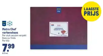 Metro Chef varkenshaas, Per stuk vacuüm verpakt, Doos ca. 5 kilo Per kilo, 7.99, 8.71 incl. Chef, LAAGSTE PRIJS, VARKENSHAAS, ZONDER KETTING, ca. 5 kilo. De Metro Chef varkenshaas is een hoogwaardig stuk vlees van de beste kwaliteit. Elke varkenshaas is zorgvuldig vacuüm verpakt om de versheid te behouden. Met een gewicht van ongeveer 5 kilo per doos, is dit product perfect voor horecabedrijven of grote gezinnen. De prijs per kilo is slechts 7.99, wat neerkomt op 8.71 inclusief btw. Geniet van de heerlijke smaak en malsheid van deze varkenshaas zonder ketting. Bestel nu en profiteer van de scherpe prijs van Metro Chef varkenshaas!