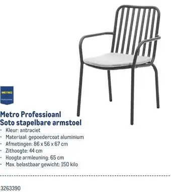 De prijs van de Metro Professioanl Soto stapelbare armstoel kan ook teruggevonden worden hierboven op de pagina, samen met de datum van wanneer de aanbieding beschikbaar is. Ook kun je de prijzen in de huidige Makro folder of op de Makro website controleren. De aanbiedingen verzekeren je van het kopen van de Makro producten voor de laagste prijs.