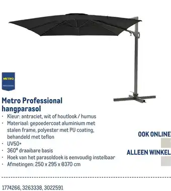 De Metro Professional hangparasol is een stijlvolle toevoeging aan je tuin of terras. Gemaakt van gepoedercoat aluminium met een stalen frame en polyester met PU coating, behandeld met teflon en UV50+. De parasol heeft een 360° draaibare basis en de hoek van het parasoldoek is eenvoudig instelbaar. Met afmetingen van 250 x 295 x 370 cm biedt deze parasol voldoende schaduw op zonnige dagen. Kies uit de kleuren antraciet, wit of houtlook/humus om de parasol perfect te laten aansluiten bij jouw buitenruimte. De Metro Professional hangparasol is zowel online als in de winkel verkrijgbaar onder de productnummers 1774266, 3263338 en 3022591.