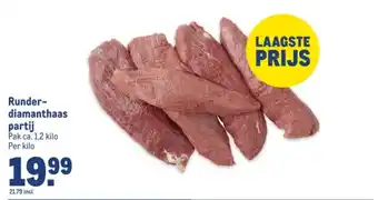 De prijs van de Runder- diamanthaas partij kan ook teruggevonden worden hierboven op de pagina, samen met de datum van wanneer de aanbieding beschikbaar is. Ook kun je de prijzen in de huidige Makro folder of op de Makro website controleren. De aanbiedingen verzekeren je van het kopen van de Makro producten voor de laagste prijs.