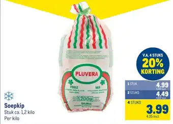 Geniet van een heerlijke soepkip van ca. 1,2 kilo, perfect voor het maken van een smaakvolle bouillon of soep. Deze kip is geviscerated, dieproze zonder ingewanden en klaar om te koken. Profiteer van de aanbieding van 20% korting bij aankoop van 4 stuks, voor slechts 4,99 per kilo (5,44 incl. btw). De soepkippen zijn van hoge kwaliteit en kunnen worden gekocht per stuk, 2 stuks, 4 stuks of meer. Maak gebruik van deze voordelige prijs en bereid een heerlijke maaltijd voor het hele gezin. Bestel nu jouw verse soepkippen en geniet van de smaak en kwaliteit die PLUVERA te bieden heeft.