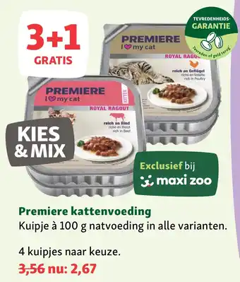 Ontdek nu de Tevredenheids-Garantie van Premiere Kattenvoeding bij Maxi Zoo! Koop 3 kuipjes natvoeding en ontvang het 4e kuipje helemaal GRATIS. Kies uit alle varianten zoals Royal Ragout rijk aan Gevogelte, rijk aan Rundvlees, of Royal Ragout rijk aan Kip. Speciaal voor KITTEN of volwassen katten. Met de exclusieve Premiere I❤my cat formule. Als je niet tevreden bent, krijg je je geld terug! Profiteer nu van de KIES & MIX actie bij Maxi Zoo en geef jouw kat de beste voeding. Alleen verkrijgbaar bij Maxi Zoo, dus haal snel jouw 3+1 GRATIS Premiere Kattenvoeding kuipjes van 100 g in huis!