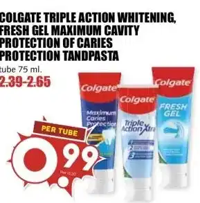 COLGATE TRIPLE ACTION WHITENING, FRESH GEL MAXIMUM CAVITY PROTECTION OF CARIES PROTECTION TANDPASTA aanbieding bij MCD Supermarkt – binnenkort verwacht