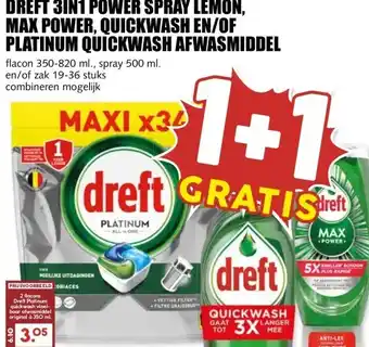 DREFT 3IN1 POWER SPRAY LEMON, MAX POWER, QUICKWASH EN/OF PLATINUM QUICKWASH AFWASMIDDEL korting bij MCD Supermarkt