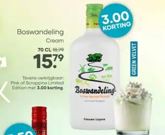 Geniet van de heerlijke Boswandeling Cream, een romige likeur met de smaak van het bos. Deze limited edition is verkrijgbaar in Pink of Scroppino variant met €3,00 korting. De Creamy Liquor is perfect om puur te drinken, in the mix te gebruiken of te combineren met andere drankjes. Probeer ook de Green Velvet variant voor een unieke smaakbeleving. Met de code '1579' ontvang je €3,50 korting op je aankoop. Mis deze kans niet en haal de Boswandeling Cream in huis voor een verrassende twist aan je drankjes. Tevens verkrijgbaar bij Mitra.