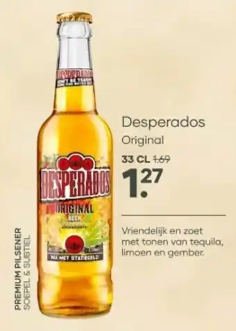 De aanbieding is verkrijgbaar in verschillende winkels, bekijk alle producten om de goedkoopste Desperados te krijgen. Als je graag wilt kijken of het artikel met meer korting te koop is in een andere winkel, bekijk de categorie 'Slijters'. Wellicht vind je deze aanbiedingen ook interessant: Desperados, Desperados Virgin 0.0 & Desperados Original 6x0.33L 2x.