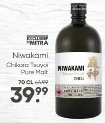 De prijs van de Niwakami Chikara Tsuyoi Pure Malt kan ook teruggevonden worden hierboven op de pagina, samen met de datum van wanneer de aanbieding beschikbaar is. Ook kun je de prijzen in de huidige Mitra folder of op de Mitra website controleren. De aanbiedingen verzekeren je van het kopen van de Mitra producten voor de laagste prijs.
