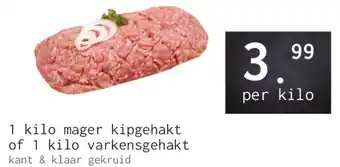 1 kilo mager kipgehakt of varkensgehakt, kant-en-klaar gekruid, 3.99 per kilo