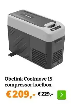 De prijs van de Obelink Coolmove 15 compressor koelbox kan ook teruggevonden worden hierboven op de pagina, samen met de datum van wanneer de aanbieding beschikbaar is. Ook kun je de prijzen in de huidige Obelink folder of op de Obelink website controleren. De aanbiedingen verzekeren je van het kopen van de Obelink producten voor de laagste prijs.