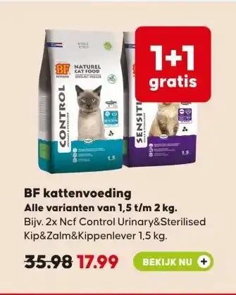 Nu in de aanbieding bij Pets Place: BF kattenvoeding Alle varianten van 1,5 t/m 2 kg.✅ Actie geldig van 23-02 t/m 22-03.