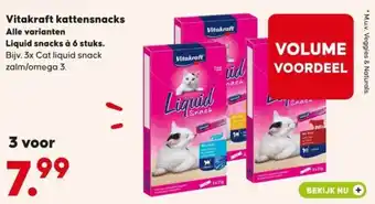 Verwen jouw kat met de heerlijke Vitakraft kattensnacks in alle varianten. Profiteer van het VOLUME VOORDEEL en koop 3 voor slechts 7.99. Kies bijvoorbeeld voor de Cat liquid snacks à 6 stuks, zoals de zalm/omega 3 variant. Deze snacks zijn perfect als beloning of tussendoortje voor jouw geliefde huisdier. De Vitakraft kattensnacks zijn van hoge kwaliteit en zorgen voor een smakelijke traktatie waar jouw kat dol op zal zijn. Bekijk nu ons assortiment en ontdek de verschillende smaken en texturen die jouw kat zeker zullen bekoren. Let op: het VOLUME VOORDEEL geldt voor alle varianten, met uitzondering van Veggies & Naturals. Mis deze aanbieding niet en verwen jouw kat vandaag nog!