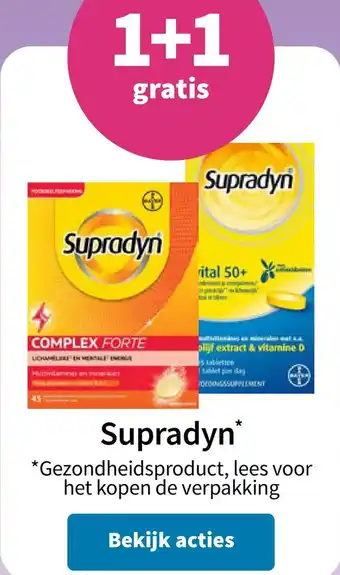 Plein.nl biedt naast de Supradyn een ruime collectie producten aan. Houd de wekelijkse Plein.nl folder in de gaten om de beste aanbiedingen en acties te vinden. Naast Supradyn, kunt u ook de volgende aanbiedingen vinden: Supradyn, Supradyn & Supradyn Vital 50+ multivitamine.