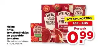 Nu in de aanbieding bij PLUS: Heinz Frito, tomatenblokjes en gezeefde tomaten✅ Actie geldig van 1-01 t/m 6-01.