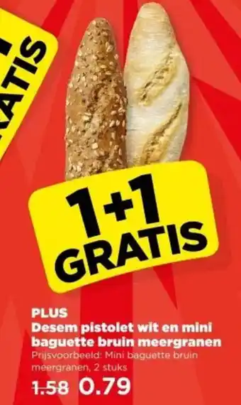 PLUS Desem pistolet wit en mini baguette bruin meergranen 1+1 GRATIS