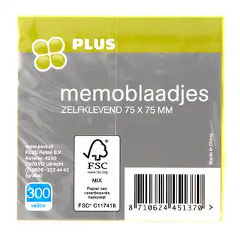 PLUS Zelfklevende memoblaadjes 300 vel FSC Per 1 st 1+1 gratis