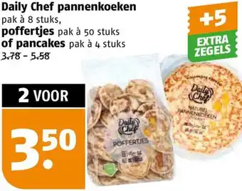 Geniet van heerlijke Daily Chef pannenkoeken, poffertjes of pancakes in een handige verpakking. Kies uit een pak à 8 stuks pannenkoeken, een pak à 50 stuks poffertjes of een pak à 4 stuks pancakes. Deze lekkernijen zijn verkrijgbaar voor een prijs tussen 3.78 en 5.58 euro. Bij aankoop van 2 verpakkingen ontvang je extra zegels voor leuke kortingen. Profiteer van de actie waarbij je 2 verpakkingen kunt kopen voor slechts 3.50 euro. De Daily Chef pannenkoeken, poffertjes en pancakes zijn perfect voor een smakelijk ontbijt of als snack tussendoor. Probeer nu de Naturel Pannenkoeken van Daily Chef en ontdek de heerlijke smaak. Haal snel jouw favoriete variant in huis en geniet van een heerlijke traktatie!
