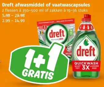 Profiteer nu van de geweldige aanbieding op Dreft afwasmiddel of vaatwascapsules! Koop 2 flessen van 350-500 ml of zakken van 19-36 stuks voor slechts 5.98-29.98 en ontvang de tweede gratis. Dreft staat bekend om zijn krachtige formule die zelfs de meest hardnekkige vetten en vuil verwijdert. Met de Quickwash technologie ben je verzekerd van een schone vaat in een handomdraai. De vaatwascapsules zorgen voor een langdurige glans en beschermen je vaat tegen kalkaanslag. Profiteer van deze aanbieding en geniet langer van een stralend schone vaat. Haal nu jouw Dreft afwasmiddel of vaatwascapsules in huis en bespaar tot wel 14.99 euro!