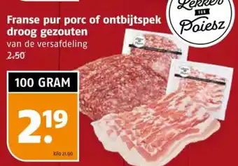 De prijs van de Franse pur porc of ontbijtspek droog gezouten kan ook teruggevonden worden hierboven op de pagina, samen met de datum van wanneer de aanbieding beschikbaar is. Ook kun je de prijzen in de huidige Poiesz folder of op de Poiesz website controleren. De aanbiedingen verzekeren je van het kopen van de Poiesz producten voor de laagste prijs.