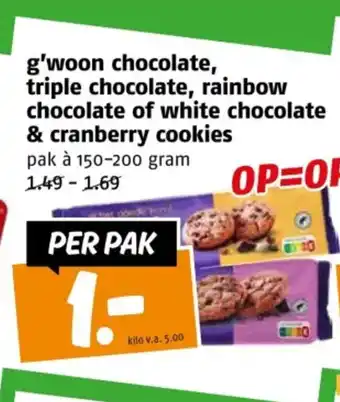 De prijs van de G'woon chocolate, triple chocolate, rainbow chocolate of white chocolate & cranberry cookies kan ook teruggevonden worden hierboven op de pagina, samen met de datum van wanneer de aanbieding beschikbaar is. Ook kun je de prijzen in de huidige Poiesz folder of op de Poiesz website controleren. De aanbiedingen verzekeren je van het kopen van de Poiesz producten voor de laagste prijs.