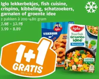 Iglo lekkerbekjes, fish cuisine, crispino, kibbeling, schatzoekers, garnalen of groente idee korting bij Poiesz