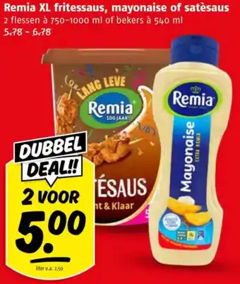Geniet van de heerlijke smaak van Remia XL fritessaus, mayonaise of satésaus met deze geweldige aanbieding! Koop nu 2 flessen à 750-1000 ml of bekers à 540 ml voor slechts 5.78-6.78. Profiteer van de LANG LEVE 100 JAAR! traditie van Remia en maak je gerechten compleet met de heerlijke sauzen. Deze kant-en-klare sauzen zijn van hoge kwaliteit en zorgen voor een extra romige smaak. Met liter v.a. 2.50 is het ook nog eens voordelig genieten. Mis deze DUBBEL DEAL niet en haal snel jouw favoriete Remia sauzen in huis. Perfect voor bij friet, snacks, salades en nog veel meer!