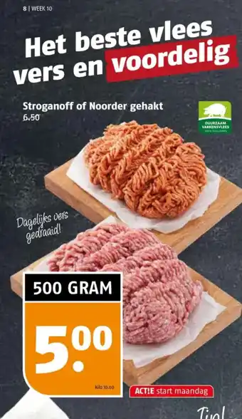 Het beste vlees vers en voordelig! Deze week in de aanbieding: Stroganoff of Noorder gehakt, 500 gram voor slechts 6.50. Ons gehakt wordt dagelijks vers gedraaid van duurzaam varkensvlees, 100% Hollands. Profiteer van deze actie die start op maandag en sla snel je voorraad in. Ons gehakt is van topkwaliteit en perfect voor het bereiden van heerlijke gerechten zoals gehaktballen, pasta's of ovenschotels. Met kiloprijs van 10.00 euro is deze aanbieding extra voordelig. Mis het niet en geniet van ambachtelijk gehakt van de beste kwaliteit. Tip: probeer ook eens onze andere vleesproducten en ontdek de smaak van echt Hollands varkensvlees!