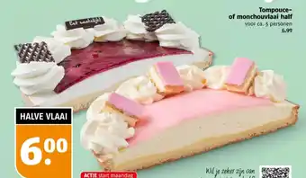 Wil je zeker zijn van jouw favoriete gebak? Vanaf maandag is de Tompouce- of monchouvlaai half voor circa 5 personen in de aanbieding voor slechts 6.99! Geniet van deze heerlijke HALVE VLAAI met een keuze tussen tompouce- of monchou smaak. Perfect voor een feestje of gewoon als verwennerij voor jezelf. Zorg ervoor dat je op tijd bent, want deze ACTIE start maandag en is slechts tijdelijk beschikbaar. Dus haal snel jouw favoriete gebak in huis en zeg alvast: Eet smakelijk!