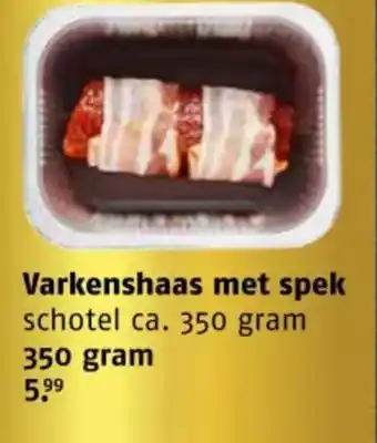 De prijs van de Varkenshaas met spek kan ook teruggevonden worden hierboven op de pagina, samen met de datum van wanneer de aanbieding beschikbaar is. Ook kun je de prijzen in de huidige Poiesz folder of op de Poiesz website controleren. De aanbiedingen verzekeren je van het kopen van de Poiesz producten voor de laagste prijs.