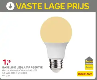 De prijs van de Baseline Ledlamp Peertje kan ook teruggevonden worden hierboven op de pagina, samen met de datum van wanneer de aanbieding beschikbaar is. Ook kun je de prijzen in de huidige Praxis folder of op de Praxis website controleren. De aanbiedingen verzekeren je van het kopen van de Praxis producten voor de laagste prijs.