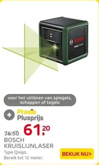 Praxis biedt naast de Bosch kruislijnlaser een ruime collectie producten aan. Houd de wekelijkse Praxis folder in de gaten om de beste aanbiedingen en acties te vinden. Naast Bosch kruislijnlaser, kunt u ook de volgende aanbiedingen vinden: Bosch kruislijnlaser quigo 3, Bosch kruislijnlaser universal level & Bosch Kruislijnlaser Quigo Green - 12m -.