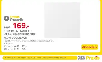 De prijs van de Eurom infrarood verwarmingspaneel mon soleil wifi kan ook teruggevonden worden hierboven op de pagina, samen met de datum van wanneer de aanbieding beschikbaar is. Ook kun je de prijzen in de huidige Praxis folder of op de Praxis website controleren. De aanbiedingen verzekeren je van het kopen van de Praxis producten voor de laagste prijs.