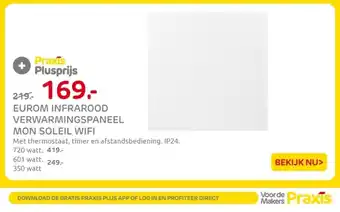 De prijs van de Eurom infrarood verwarmingspaneel mon soleil wifi kan ook teruggevonden worden hierboven op de pagina, samen met de datum van wanneer de aanbieding beschikbaar is. Ook kun je de prijzen in de huidige Praxis folder of op de Praxis website controleren. De aanbiedingen verzekeren je van het kopen van de Praxis producten voor de laagste prijs.