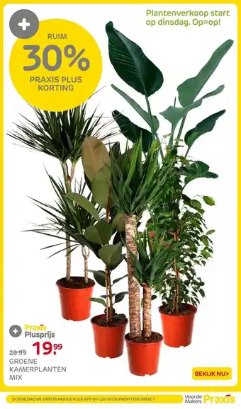 De prijs van de Groene kamerplanten mix ⌀24cm ↕120cm kan ook teruggevonden worden hierboven op de pagina, samen met de datum van wanneer de aanbieding beschikbaar is. Ook kun je de prijzen in de huidige Praxis folder of op de Praxis website controleren. De aanbiedingen verzekeren je van het kopen van de Praxis producten voor de laagste prijs.