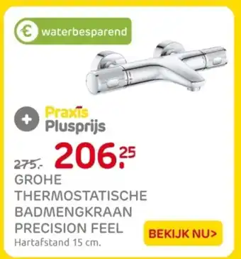 De prijs van de Grohe thermostatische badmengkraan precision feel kan ook teruggevonden worden hierboven op de pagina, samen met de datum van wanneer de aanbieding beschikbaar is. Ook kun je de prijzen in de huidige Praxis folder of op de Praxis website controleren. De aanbiedingen verzekeren je van het kopen van de Praxis producten voor de laagste prijs.