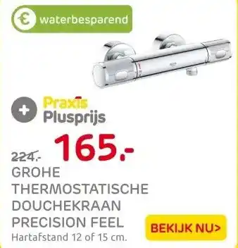 De prijs van de Grohe Thermostatische Douchekraan kan ook teruggevonden worden hierboven op de pagina, samen met de datum van wanneer de aanbieding beschikbaar is. Ook kun je de prijzen in de huidige Praxis folder of op de Praxis website controleren. De aanbiedingen verzekeren je van het kopen van de Praxis producten voor de laagste prijs.