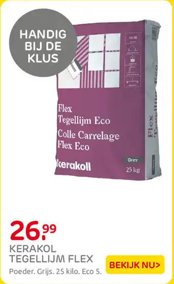De Kerakol Tegellijm Flex is momenteel met korting verkrijgbaar bij Praxis. Hier vind je alle details over prijs, geldigheidsduur en actievoorwaarden. Vergeet niet om ook andere aanbiedingen en deals voor Kerakol Tegellijm Flex te bekijken zodat je zeker weet dat je de beste prijs betaalt. De kortingsactie loopt van 20-04-2026 tot 26-04-2026. Is de actie inmiddels verlopen? Geen zorgen, vergelijk dan soortgelijke aanbiedingen of volg de productcategorie voor toekomstige prijsverlagingen. Zo koop je altijd met voordeel.Veelgestelde vragen over Kerakol Tegellijm Flex