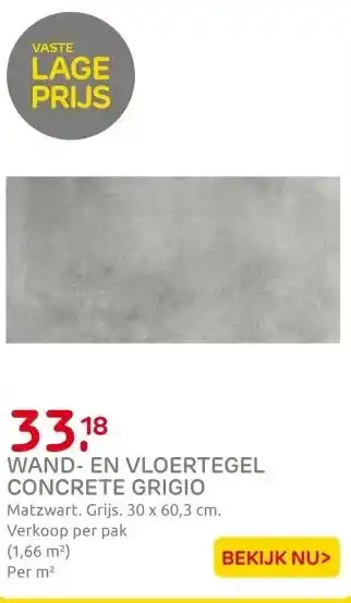 De prijs van de Natuursteenlook Tegel Concrete Grigio - kan ook teruggevonden worden hierboven op de pagina, samen met de datum van wanneer de aanbieding beschikbaar is. Ook kun je de prijzen in de huidige Praxis folder of op de Praxis website controleren. De aanbiedingen verzekeren je van het kopen van de Praxis producten voor de laagste prijs.