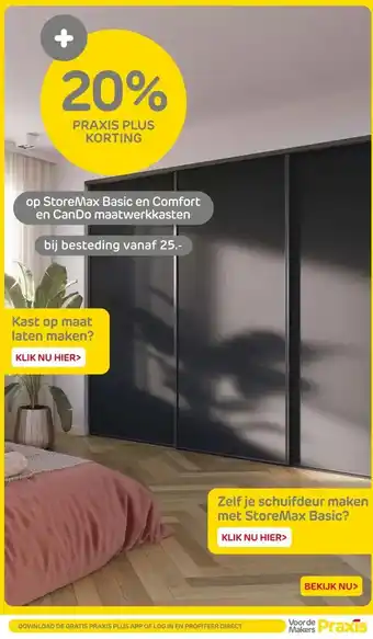 Praxis biedt naast de op StoreMax Basic en Comfort en CanDo maatwerkkasten een ruime collectie producten aan. Houd de wekelijkse Praxis folder in de gaten om de beste aanbiedingen en acties te vinden. Naast op StoreMax Basic en Comfort en CanDo maatwerkkasten, kunt u ook de volgende aanbiedingen vinden: Lundia & CanDo maatwerkkasten, Op alle Storemax schuifdeursystemen Basic & Comfort.