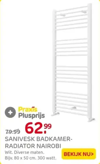 De Sanivesk badkamer-radiator Nairobi is een stijlvolle toevoeging aan elke badkamer. Met een afmeting van bijvoorbeeld 80 x 50 cm en een vermogen van 300 watt zorgt deze radiator voor een aangename temperatuur in de ruimte. De radiator is verkrijgbaar in het wit en in diverse maten, waardoor er altijd een geschikt formaat te vinden is voor jouw badkamer. Bij Praxis is deze radiator verkrijgbaar voor slechts 79.99 als Plusprijs, in plaats van de normale prijs van 62.99. Bekijk nu ons assortiment en geef jouw badkamer een upgrade met de Sanivesk badkamer-radiator Nairobi!