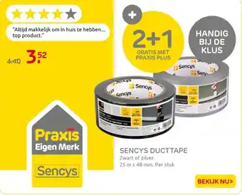 De prijs van de Sencys duct tape kan ook teruggevonden worden hierboven op de pagina, samen met de datum van wanneer de aanbieding beschikbaar is. Ook kun je de prijzen in de huidige Praxis folder of op de Praxis website controleren. De aanbiedingen verzekeren je van het kopen van de Praxis producten voor de laagste prijs.