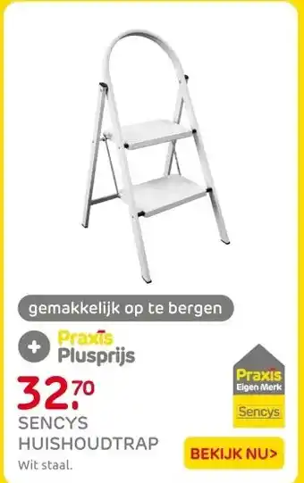 De prijs van de Sencys huishoudtrap wit 2-treeds kan ook teruggevonden worden hierboven op de pagina, samen met de datum van wanneer de aanbieding beschikbaar is. Ook kun je de prijzen in de huidige Praxis folder of op de Praxis website controleren. De aanbiedingen verzekeren je van het kopen van de Praxis producten voor de laagste prijs.