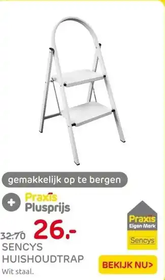 De prijs van de Sencys huishoudtrap wit 2-treeds kan ook teruggevonden worden hierboven op de pagina, samen met de datum van wanneer de aanbieding beschikbaar is. Ook kun je de prijzen in de huidige Praxis folder of op de Praxis website controleren. De aanbiedingen verzekeren je van het kopen van de Praxis producten voor de laagste prijs.