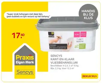 De prijs van de SENCYS KANT EN KLAAR VLIESBEHANGLIJM kan ook teruggevonden worden hierboven op de pagina, samen met de datum van wanneer de aanbieding beschikbaar is. Ook kun je de prijzen in de huidige Praxis folder of op de Praxis website controleren. De aanbiedingen verzekeren je van het kopen van de Praxis producten voor de laagste prijs.