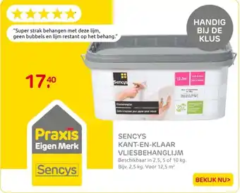 De prijs van de Sencys kant en klaar vliesbehanglijm kan ook teruggevonden worden hierboven op de pagina, samen met de datum van wanneer de aanbieding beschikbaar is. Ook kun je de prijzen in de huidige Praxis folder of op de Praxis website controleren. De aanbiedingen verzekeren je van het kopen van de Praxis producten voor de laagste prijs.